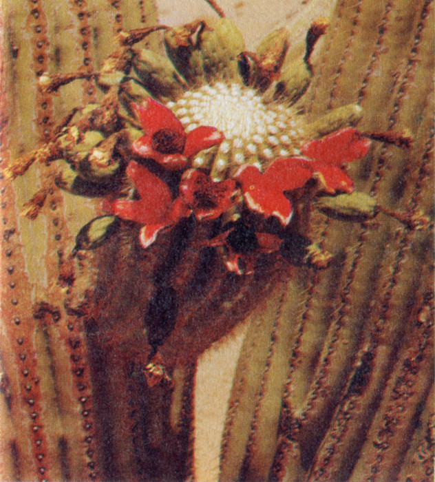The roots that serve this living storage tank are no less remarkable. The tap root is small and acts as little more than a pad to support the great weight of the plant. The radial roots are heavy and of great length. They radiate out from the base of the Saguaro, usually no more than a foot below the surface of the ground, but often to a distance equal to the height of the plant. They serve the double purpose of gathering food and moisture, and of holding the great bulk of the trunk upright against the fierce desert storms. In their progress 3 through the rocky soil in which the Saguaro usually grows they become contorted and act as anchors which are not easily dislodged.