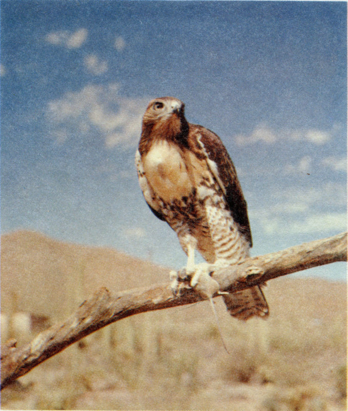 This large Buteo is a common resident of the Monument. It frequently nests among the arms of the Saguaro. Since its food consists mainly of small rodents it is one of the most beneficial of our birds.
