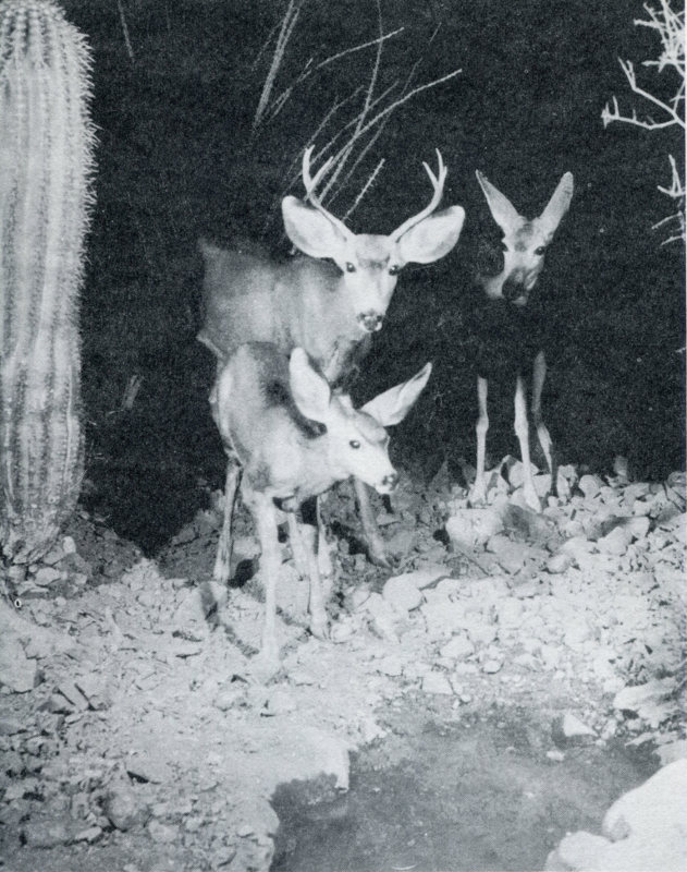 Mexican Mule Deer—Most people are accustomed to thinking of deer as animals of the forest, but surprisingly enough the rough foothill country in the desert supports a large population of deer. The Mule Deer is a true vegetarian and during the fall and winter browses extensively on trees and shrubs and during spring and summer consumes a variety of grasses and herbs. The young are born in late spring or summer and the fawns are sometimes seen at that time of year.