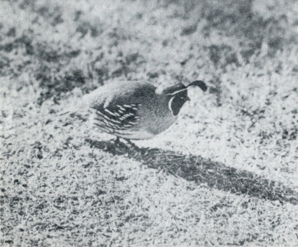Gambel Quail—A common desert dweller that may be observed at any season of the year. It nests on the ground.