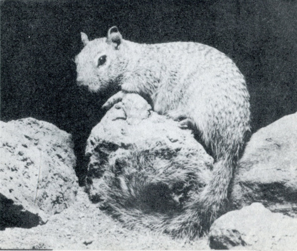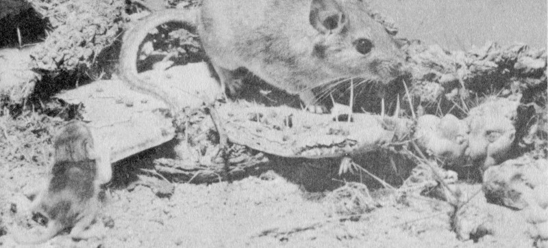 White-throated Wood Rat—Commonly known as the Pack Rat, this interesting animal builds its nest in a mound of cactus segments. Marauders think twice before they molest this spiny home. Seldom seen in daylight. Note the baby, lower left.