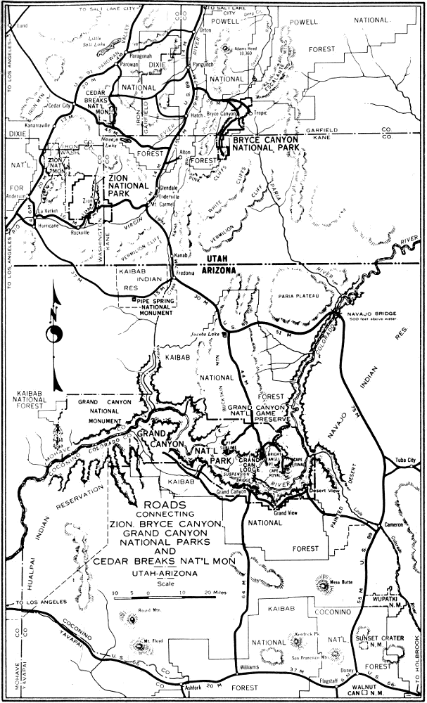 Motorists on the Arrowhead Trail, United States Highway No. 91, from the north may turn off at Anderson Junction, 33 miles south of Cedar City, and those from the south may turn off at Harrisburg Bench Junction, 10 miles north of St. George, and reach Zion over State Route No. 15. Motorists on United States Highway No. 89 should turn off on State Route No. 15 at Mount Carmel Junction, entering Zion by the east entrance.