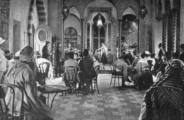“On one of these nightly rambles,” Paul resumed, “we turned into a street closed at one end by a stately building of pinnacles and a sloping roof, and windows of richly stained glass. This building was a blaze of light, and in the courtyard in front of it motor-cars and carriages were taking up ladies in bright evening frocks and coats and men with orders upon their breasts.”