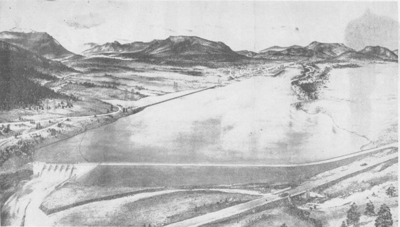 This is an artist’s conception of Lake Estes. Its waters held back by Olympus Dam. A half-mile above the inlet is the Village of Estes Park, and beyond the town the grandeur of the Rockies and the Continental Divide.