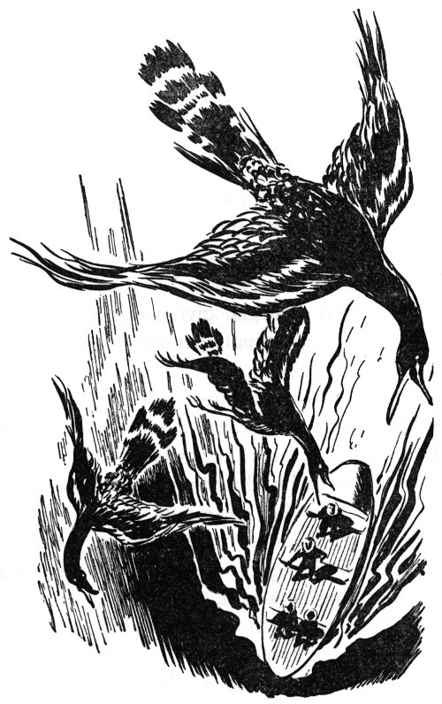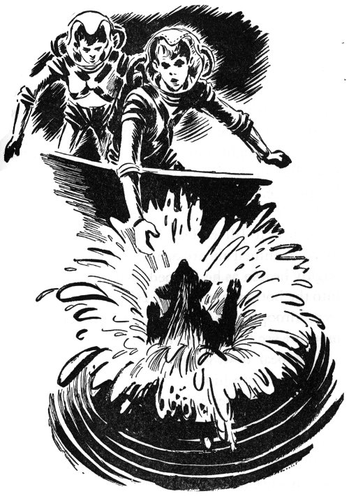 The girl was stretched out waist high in the air, in which position her father could best see her injury. Ted held her so that a sudden movement would not send her floating off. The scientist found a cut on Jill’s temple where she had struck the air vent. She began stirring. In a few seconds she had recovered consciousness. She was pale and smiled feebly.