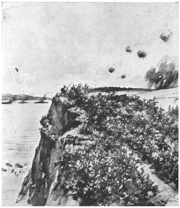 Five picket-boats, each towing five boats or launches full of men, steamed alongside the River Clyde and went ahead when she grounded. She took the ground rather to the right of the little beach, some 400 yards from the ruins of Sedd-el-Bahr Castle, before the Turks had opened fire; but almost as she grounded, when the picket-boats with their tows were ahead of her, only 20 or 30 yards from the beach, every rifle and machine gun in the castle, the town above it, and in the curved, low, strongly trenched hill along the bay, began a murderous fire upon ship and boats. There was no question of their missing. They had their target on the front and both flanks at ranges between 100 and 300 yards in clear daylight, 30 boats bunched together and crammed with men and a good big ship. The first outbreak of fire made the bay as white as a rapid, for the Turks fired not less then 10,000 shots a minute for the first few minutes of that attack. Those not killed in the boats at the first discharge jumped overboard45 to wade or swim ashore. Many were killed in the water, many, who were wounded, were swept away and drowned; others, trying to swim in the fierce current, were drowned by the weight of their equipment. But some reached the shore, and these instantly doubled out to cut the wire entanglements and were killed, or dashed for the cover of a bank of sand or raised beach which runs along the curve of the bay. Those very few who reached this cover were out of immediate danger, but they were only a handful. The boats were destroyed where they grounded.