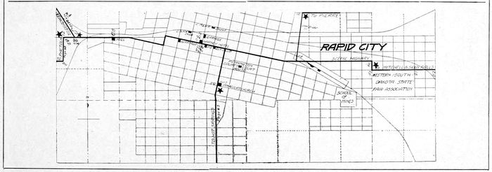 At the point of entrance to the Black Hills from the east, Rapid City has become a leading industrial and railway center. Good hotel and garage accommodations make this a pleasant stopping place in the foothills. The trip westward into the Hills along Rapid Creek to Pactola by auto, or by rail to Mystic, should not be overlooked by any tourist in this territory.