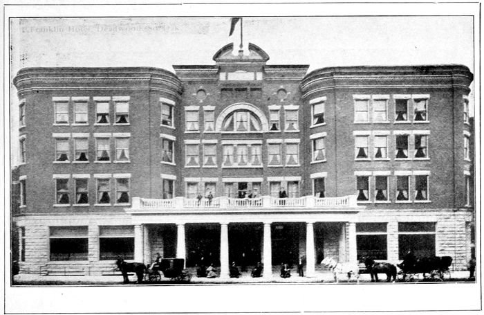 The Hotel Franklin is recognized as the finest hotel in the state and is the headquarters for tourists. Deadwood is in the heart of the pictueresque “Playgrounds of South Dakota”, where fishing, hunting, camping and fine automobile roads through the pine clad Hills and Canyons form a part of the attractions that make it the Mecca of Tourists. Mosquitos and heat are unknown. The hub of all points of interest in the Hills is Deadwood. The famous Homestake, the largest gold mine in the world, and Crystal Cave, the great underground cavern that extends for miles are reached from Deadwood.