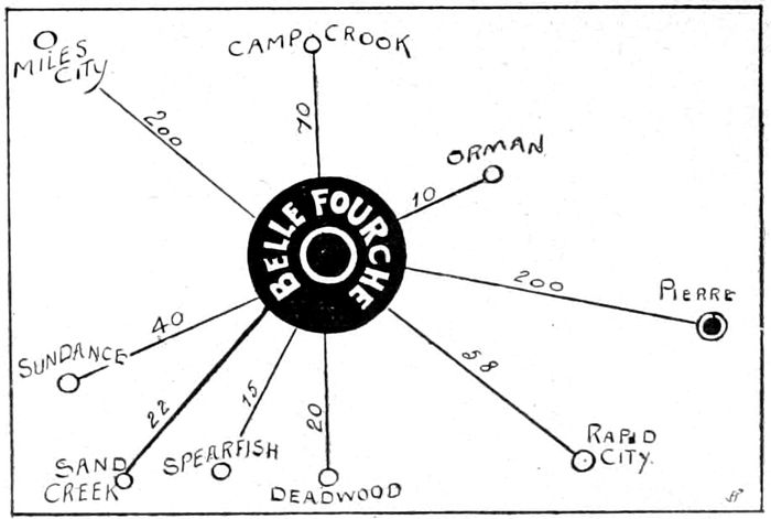 Twenty-eight miles north of Deadwood and close to the 100,000 acre government irrigation project is a thriving county seat town of 3000 population. It has been a noted shipping point for those interested in cattle and sheep raising in years gone by and is now becoming the principal center of business for the adjacent irrigated districts.