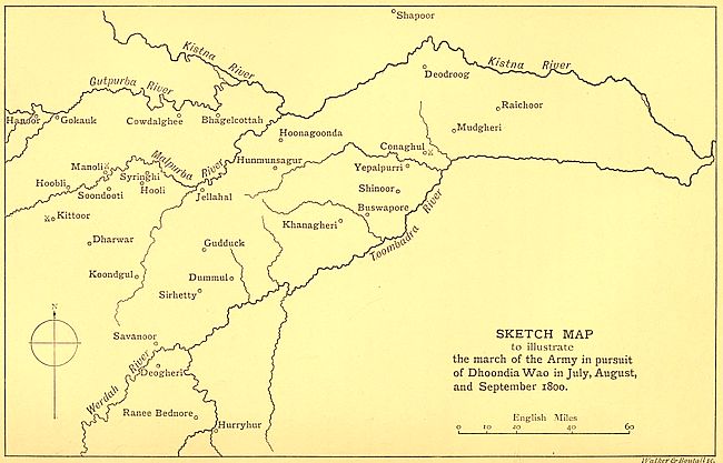 | Floyd leaves 19th—Dhoondia Wao—Force formed under Colonel Wellesley to capture him—Advance on Ranee Bednore—Capture of Koondgul, Dummul, Gudduck—Division of Dhoondia’s force destroyed at Manoli—Dhoondia doubles back—Again hemmed in—Dhoondia crosses Malpurba river—Pursuit drawing to a close—Dhoondia caught at Conaghul—Dhoondia killed, and his force destroyed—19th return to Mysore—The Rajah of Bullum—Regiment ordered to Arcot | 114 |