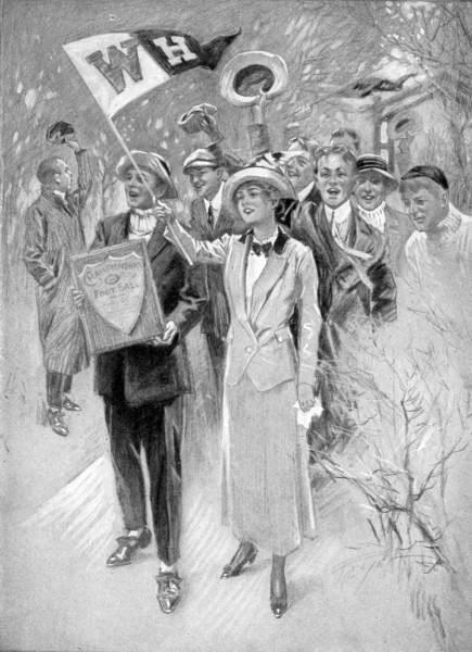 An hour later, after House had cheered itself hoarse in front of the gymnasium, the West House eight marched back across the park, Sandy striding ahead with the Silver Shield held proudly before him. The West House eight did I say? Rather the West House nine, for beside Sandy tripped Miss Molly Elizabeth Curtis, the Obnoxious Kid, waving triumphantly her red and white banner!