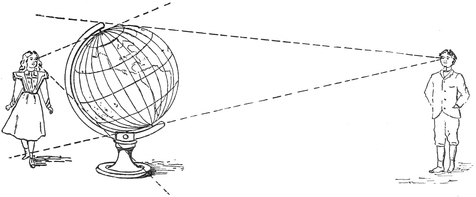 I ought here to explain a principle which those who are learning about the stars must always bear in mind. The principle asserts that the further a body is, the smaller it looks. Perhaps this will be understood from the adjoining little sketch (Fig. 8). It represents a great globe, on which oceans and continents are shown,26 and you see a little boy and a little girl are looking at the globe. The girl stands quite close to it, and I have drawn two dotted lines from her eye, one to the top of the globe, and the other to the under surface. If she wants to examine the entire side of the globe which is visible to her, she must first look along the upper dotted line, and then she must turn her glance downwards until she comes to the lower line, and having to turn her eyes thus up and down she will think the globe is very big, and she will be quite right. The boy is, as you see, on the other side of the globe, but I have put him much further off than the girl. I have also drawn two dotted lines from his eye to the globe, and it is plain that he will not have to turn his head much up and down to see the whole globe. He can take it all in at a glance, and to him, therefore, the globe will appear to be comparatively small, because he is sufficiently far from it. The more distant he is, the smaller it will appear. You can easily imagine that, if the globe were far enough, the two lines that would include the whole would be like those shown (Fig. 9), in which the globe is so distant that it cannot be seen in the picture. The apparent size of the globe, which is really measured by the angle between these two lines,27 would always be smaller and smaller according as the distance was greater. Now you can understand why an object seems smaller the further away it is; indeed, when sufficiently far, the object ceases to be visible at all.