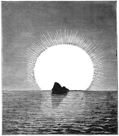 On both these evenings the sun sinks directly behind Mount Carigou in the Pyrenees; this mountain is a long way from Marseilles—no less, indeed, than one hundred and fifty-eight miles. But the mountain is so lofty, that when the sky is clear, the summit can be distinctly seen upon the sun as a background, in the way shown in the picture. This must be a very pretty sight, and it teaches us an important lesson. The sun is further away than the mountain, and yet you see the sun on both sides of the mountain, and above it. Here, then, we learn without any calculations, that the sun must be bigger than the upper part of a great mountain in the Pyrenees.