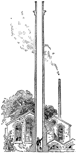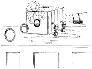 We can make many experiments with smoke-rings. Here, for instance, I take an empty box, so far as smoke is concerned, but air-rings can be driven forth from it, though you cannot see them, but you can feel them even at the other side of the room, and they will, as you see, blow out a candle. I can also shoot invisible359 air-rings at a column of smoke, and when the missile strikes the smoke it produces a little commotion and emerges on the other side, carrying with it enough of the smoke to render itself visible, while the solid black looking ring of air is seen in the interior. Still more striking is another way of producing these rings, for I charge this box with ammonia, and the rings from it you cannot see. There is a column of the vapor of hydrochloric acid that also you cannot see; but when the invisible ring enters the invisible column, then a sudden union takes place between the vapor of the ammonia and the vapor of the hydrochloric acid; the result is a solid white substance in extremely fine dust which renders the ring instantly visible.
