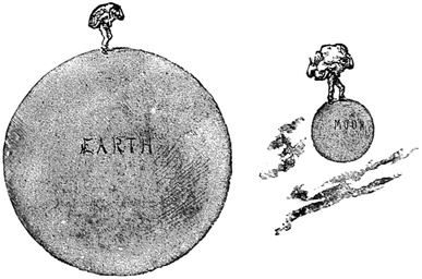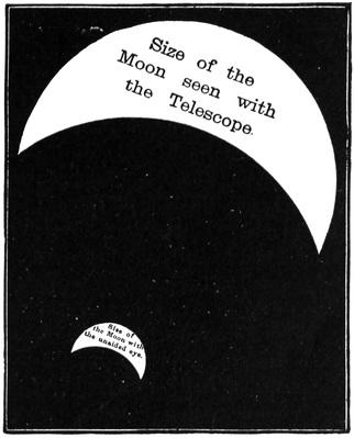 It is in astronomy that we have the best illustrations of this principle. Enormous objects seem to be small because they are so very far off. You must therefore always remember that although an object may appear to be small, this appearance may be only a delusion. It may be that the object is very big, but very distant. In astronomy, this is almost always the case, there is so much room above us, around us, on all sides in space. Look up at the ceiling. It certainly does not bound space, for there is another side to it; and then there is the roof of the house. But the roof is not a boundary, for, of course, there is the air above it, and then, higher up still, there are the clouds, and so we can carry our imagination on and on through and beyond the air up to where the stars are, and still on and on. And as there is unlimited room, the celestial bodies take advantage of it, and are, generally speaking, at distances so28 gigantic that, no matter how small they may appear, their smallness is merely deceptive.