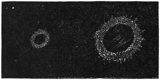 There is a fundamental difference between the illumination of these little rings that I have shown you and the great rings in the heavens. I had to illuminate our smoke with the help of the electric light, for, unless I had done so, you would not have been able to see them. This white substance formed by the union of ammonia and hydrochloric acid has, of course, no more light of its own than a piece of chalk; it requires other light falling upon it to make it visible. Were the ring nebula in Lyra composed of this material, we could not see it. The sunlight which illuminates the planets might, of course, light up such an object as the ring, if it were comparatively near us; but Lyra is at such a stupendous distance that any light which the sun could send360 out there would be just as feeble as the light we receive from a fixed star. Should we be able to show our smoke-rings, for instance, if, instead of having the electric light, I merely cut a hole in the ceiling and allowed the feeble twinkle of a star in the Great Bear to shine through? In a similar way the sunbeams would be utterly powerless to effect any illumination of objects in these stellar distances. If the sun were to be extinguished altogether, the calamity would no doubt be a very dire one so far as we are concerned, but the effect on the other celestial bodies (moon and planets excepted) would be of the slightest possible description. All the stars of heaven would continue to shine as before. Not a point in one of the constellations would be altered, not a variation in the brightness, not a change in the hue of any star could be noticed. The thousands of nebulæ and clusters would be absolutely unaltered; in fact, the total extinction of the sun would be hardly remarked in the newspapers published in the Pleiades or in Orion. There might possibly be a little line somewhere in an odd corner to the effect “Mr. So-and-So, our well-known astronomer, has noticed that a tiny star, inconspicuous to the eye, and absolutely of no importance whatever, has now become invisible.”