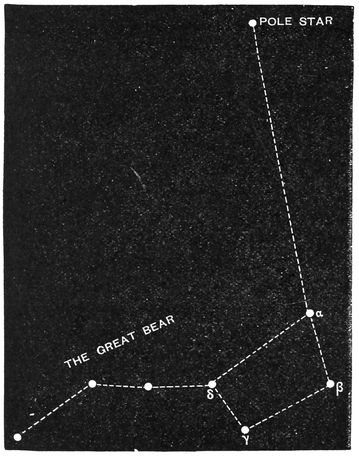 Your next lesson will be to utilize the Great Bear for the purpose of pointing out the Pole Star. Look at the two stars marked α and β. They are called the “Pointers,” because if you follow the direction they indicate along the dotted line in the figure, they will conduct your glance to the Pole. This is the most important star in the heavens to astronomers, because it happens to mark very nearly the position of the Pole on the sky. You will easily note the peculiarity of the Pole Star if you will look at it two or three times in the course of the night. It will appear to remain in the same place in the sky, while the other stars change their places from hour to hour. It is very fortunate that we have a star like this in the northern heavens; the astronomers in Australia or New Zealand can see no bright star lying near the Southern Pole which will answer the purposes that the Pole Star does so conveniently for us in the north.