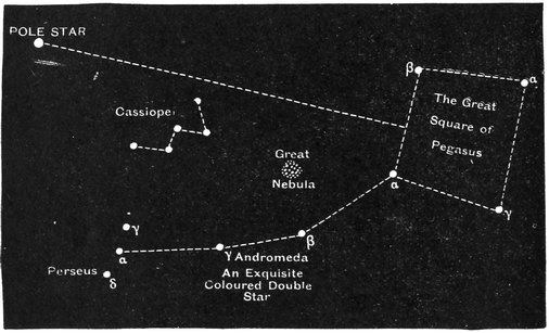 Cassiopeia is also one of the constellations that never set to British observers; but now we have to speak of groups which do set, and which, therefore, can only be observed when the proper season comes round. The first of these is “the Great Square of Pegasus”; you cannot see this group conveniently in the spring or summer, but during the autumn and winter it is well placed after nightfall. There are four conspicuous stars forming the corners of the square, and then three others marked α, γ, and β (Fig. 93), which form a sort of handle to the square. In fact, if you once recognize this group, you will perhaps see in it a resemblance to a great saucepan with a somewhat bent handle, and then you385 will be acquainted with a large tract of Star-land near the Square of Pegasus. From the figure you will see that a line imagined to be drawn from the Pole Star over the end of Cassiopeia, and then produced as far again, will just lead to the Great Square. I have also marked on this figure two objects that are of great telescopic interest; one of them is the Nebula in Andromeda, of which we had an account in the last lecture. You see it lies halfway between the corner α of the square and the group of Cassiopeia. Another interesting object is the star marked γ Andromedæ. The telescope shows it to consist of a pair of stars, the colors of which are beautifully contrasted.