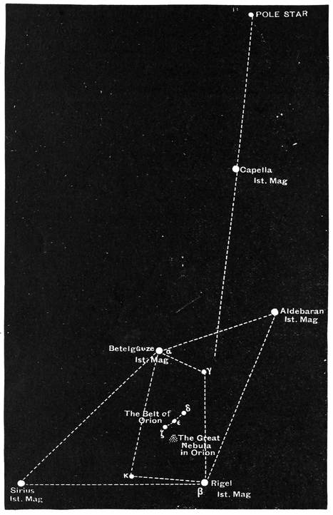 The brightest star in Orion is known either as α Orionis or as Betelgeuze, by which name it is represented in the figure. This star is of the first magnitude, and so is Rigel on the opposite side of the belt. The three stars of the belt and the two others, γ and κ, at which they point above and below, are of second magnitude.