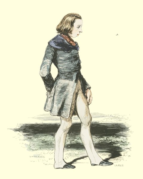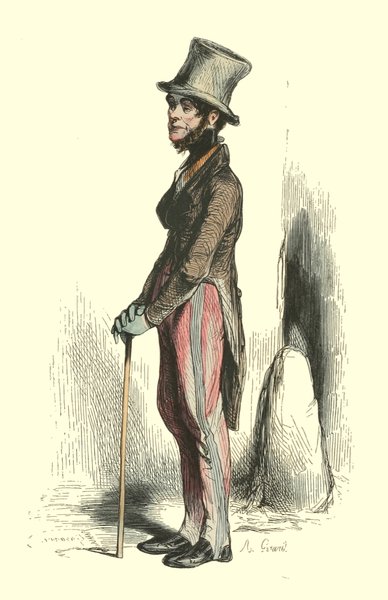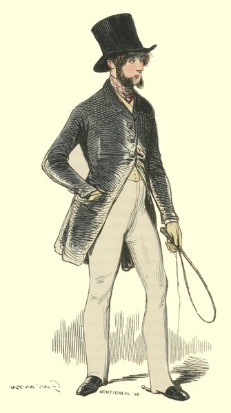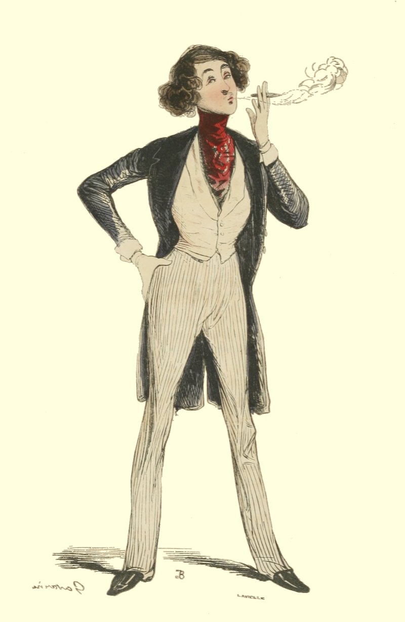 Pour qu’un jeune homme fût à la mode, il lui fallait un habit de drap fin ou de soie, suivant la saison, qui serrât exactement la taille et les bras, car on avait la prétention de paraître mince; l’embonpoint sentait la roture, et le ventre était à l’index, comme chose prohibée. L’élégant petit-maître sortait encore un gilet d’une étoffe chinée ou d’un drap chamois, des culottes de sénardine couleur jaune pâle ou gris de lin, des bas de soie à raies longitudinales et variées, des souliers étroits et lustrés à la cire luisante, des boucles d’argent taillées à facettes comme le diamant. L’été, on lui voyait un léger bambou à la main; l’hiver, il jetait sous son bras gauche un énorme manchon à longs poils soyeux, dans lequel il se serait bien gardé de cacher ses mains quand il se promenait aux Tuileries ou au Palais-Royal. N’oublions pas le chapeau de castor, qui, pendant un ou deux ans, fut d’une hauteur démesurée. Paris l’avait emprunté aux Hollandais. Je pourrais bien retracer ici ce qu’on appelait le négligé pour une certaine classe de jeunes fashionables du haut parage, auxquels on pouvait appliquer ce trait de Gilbert: