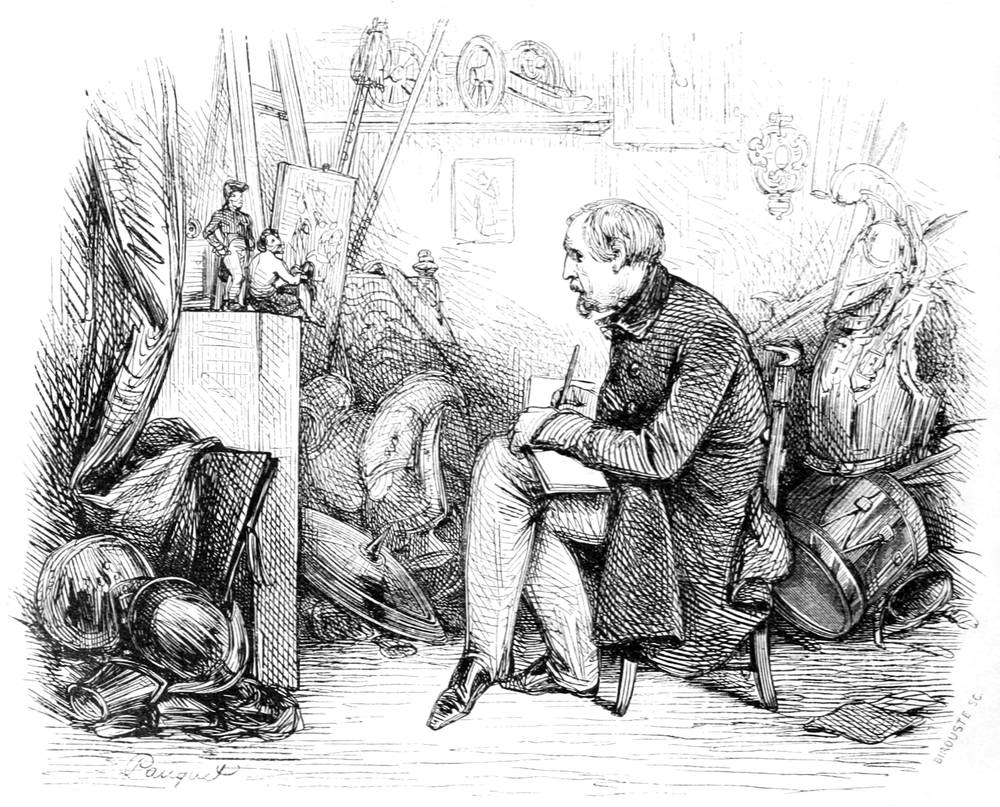 Voulez-vous un Spartacus, un César, un Cicéron, un saint Étienne, un Clovis, un Molière, etc.? Souhaitez-vous faire revivre sur la toile une notabilité quelconque de l’antiquité ou des temps modernes? Vous faut-il un baron féodal ou un serf, un Européen ou un sauvage, un martyr ou un Jupiter Olympien, un discobole ou un soldat de la république française? Allez vous-en dans une de ces rues sales et tortueuses dont fourmille notre belle capitale; montez un escalier qui tient le milieu entre une échelle et un mât de cocagne, et là, au fond de quelque grenier, vous trouverez la notabilité demandée, le saint, l’empereur, le roi, le poëte, le guerrier, ad libitum, dans la personne du modèle.