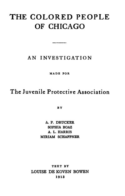In an attempt to ascertain the causes which would account for a great amount of delinquency among the colored boys and the public opinion which would so carelessly place the virtue of a colored girl in jeopardy, the Juvenile Protective Association found itself involved in a study of the industrial and social status of the colored people of Chicago.