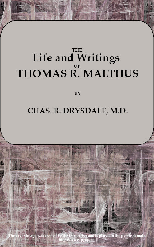 The Project Gutenberg EBook of Life and Writings of Thomas R. Malthus, by Charles R. Drysdale This eBook is for the use of anyone anywhere in the United States and most other parts of the world at no cost and with almost no restrictions whatsoever. You may copy it, give it away or re-use it under the terms of the Project Gutenberg License included with this eBook or online at www.gutenberg.org. If you are not located in the United States, you'll have to check the laws of the country where you are located before using this ebook. Title: Life and Writings of Thomas R. Malthus Author: Charles R. Drysdale Release Date: September 29, 2019 [EBook #60378] Language: English Character set encoding: UTF-8 *** START OF THIS PROJECT GUTENBERG EBOOK LIFE, WRITINGS OF THOMAS MALTHUS *** Produced by Richard Tonsing and the Online Distributed Proofreading Team at http://www.pgdp.net (This file was produced from images generously made available by The Internet Archive)