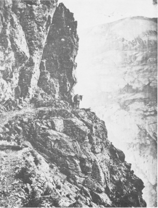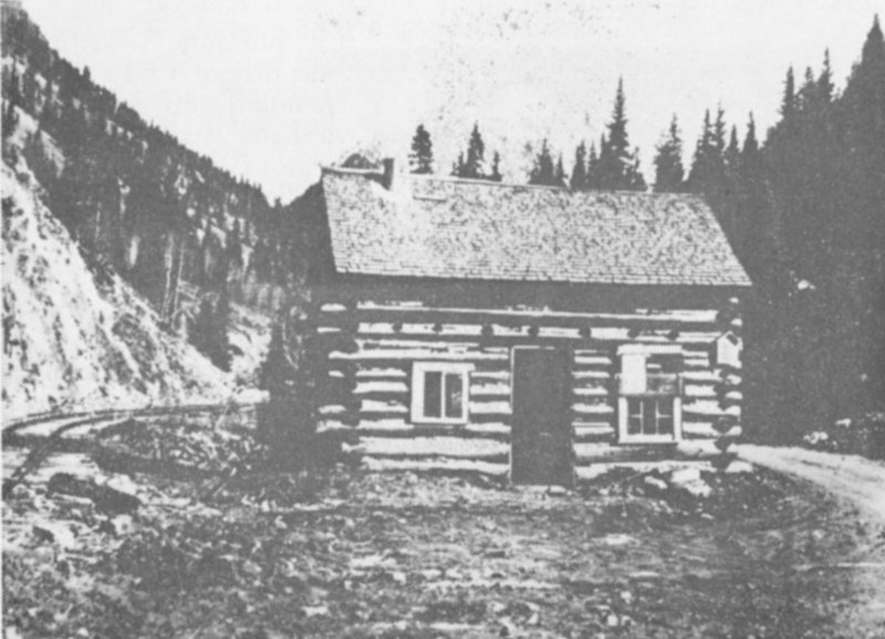 The start of the Durango-Silverton road was made in 1875. A crude mountain road reached from the present site of Rockwood for 7 about sixteen miles to the top of Coal Bank Hill. Here the road ceased and the Old Ute Trail was used by pack animals for the remaining fourteen miles into Silverton. The old trail was used until about 1877 or ’78 when a prospector, with the help of others, built a toll road up the Animas Canyon. The road started north of Rockwood, crossed the site of what is now Lake Electra, then made a drop of 2,000 feet in a distance of one and a half miles to the bottom of the canyon. Here it crossed Cascade Creek at its junction with the Animas and continued up the river to Silverton, making many crossings along the way. A toll gate was located at the entrance to the canyon near the Champion Mine. There was also a toll gate at Baker’s Bridge below Rockwood, and the fee was $3.00. Many parts of the old road can still be seen from the train.