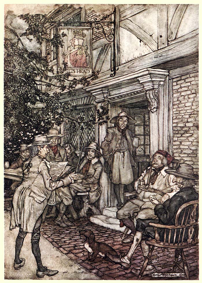 The appearance of Rip, with his long, grizzled beard, his rusty fowling-piece, his uncouth dress, and an army of women and children at his heels, soon attracted the attention of the tavern politicians. They crowded round him, eyeing him from head to foot with great curiosity. The orator bustled up to him, and, drawing him partly aside, inquired “On which side he voted?” Rip stared in vacant stupidity. Another short but busy little fellow pulled him by the arm, and, rising on tiptoe, inquired in his ear, “Whether he was Federal or Democrat?” Rip was equally at a loss to comprehend the question; when a knowing, self-important old gentleman, in a sharp cocked hat, made his way through the crowd, putting them to the right and left with his elbows as he passed, and planting himself before Van Winkle, with one arm akimbo, the other resting on his cane, his keen eyes and sharp hat penetrating, as it were, into his very soul, demanded in an austere tone, “What brought him to the election with a gun on his shoulder, and a mob at his heels; and whether he meant 19 to breed a riot in the village?” “Alas! gentlemen,” cried Rip, somewhat dismayed, “I am a poor quiet man, a native of the place, and a loyal subject of the king, God bless him!”