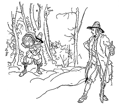 On nearer approach he was still more surprised at the singularity of the stranger’s appearance. He was a short, square-built old fellow, with thick bushy hair, and a grizzled beard. His dress was of the antique Dutch fashion: a cloth jerkin strapped round the waist—several pair of breeches, the outer one of ample volume, decorated with rows of buttons down the sides, and bunches at the knees. He bore on his shoulder a stout keg, that seemed full of liquor, and made signs for Rip to approach and assist him with the load. Though rather shy and distrustful of his new12 acquaintance, Rip complied with his usual alacrity; and mutually relieving one another, they clambered up a narrow gully, apparently the dry bed of a mountain torrent. As they ascended, Rip every now and then heard long, rolling peals, like distant thunder, that seemed to issue out of a deep ravine, or rather cleft, between lofty rocks, toward which their ragged path conducted. He paused for an instant, but supposing it to be the muttering of one of those transient thunder-showers which often take place in mountain heights, he proceeded. Passing through the ravine, they came to a hollow, like a small amphitheatre, surrounded by perpendicular precipices, over the brinks of which impending trees shot their branches, so that you only caught glimpses of the azure sky and the bright evening cloud. During the whole time Rip and his companion had laboured on in silence; for though the former marvelled greatly what could be the object of carrying a keg of liquor up this wild mountain, yet there was something strange and incomprehensible about the unknown, that inspired awe and checked familiarity.