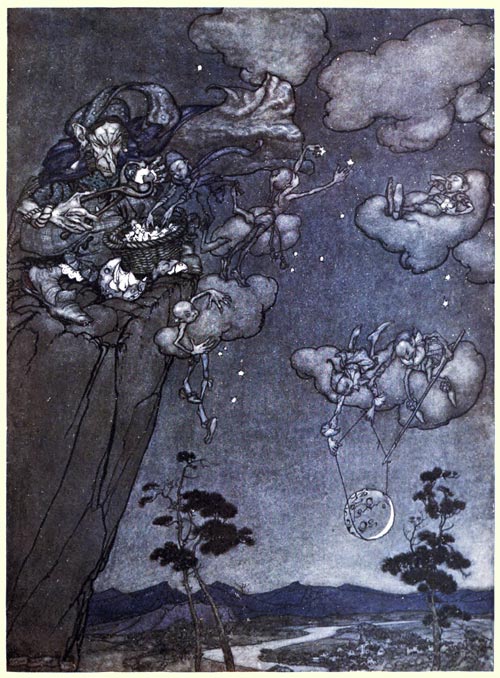 The Kaatsberg or Catskill mountains have always been a region full of fable. The Indians considered them the abode of spirits, who influenced the weather, spreading sunshine or clouds over the landscape, and sending good or bad hunting seasons. They were ruled by an old squaw spirit, said to be their mother. She dwelt on the highest peak of the Catskills, and had charge of the doors of day and night to open and shut them at the proper hour. She hung up the new moons in the skies, and cut up the old ones into stars. In times of drought, if properly propitiated, she would spin light summer clouds out of cobwebs and morning dew, and send them off from the crest of the mountain, flake after flake, like flakes of carded cotton, to float in the air, until, dissolved by the heat of the sun, they would fall in gentle showers, causing the grass to spring, the fruits to ripen, and the corn to grow an inch an hour. If displeased, however, she would brew up clouds black as ink, sitting in the midst of them like a bottle-bellied spider in the midst of its web; and when these clouds broke, woe betide the valleys!33