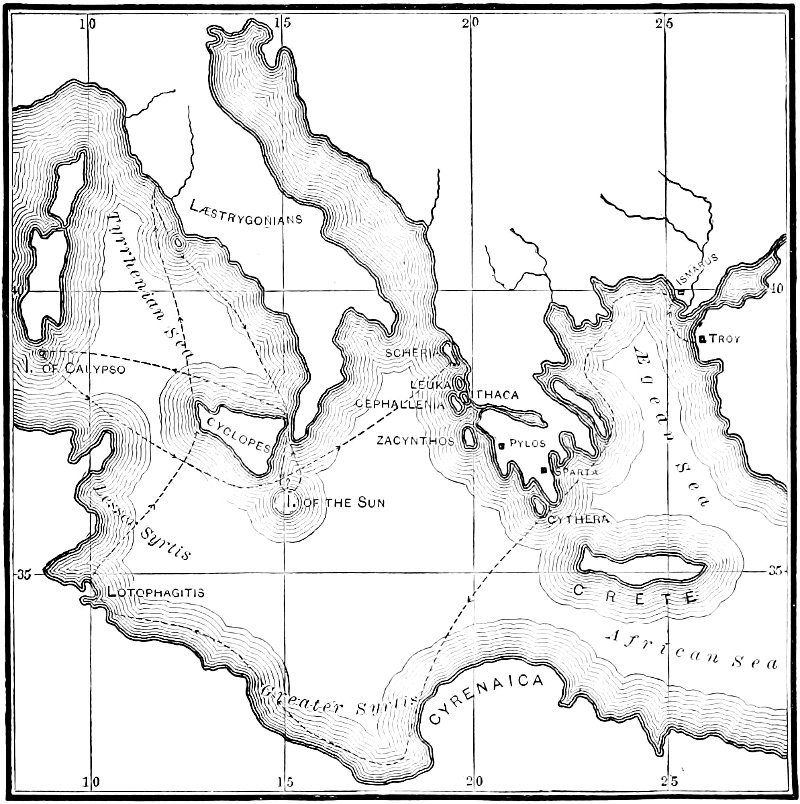 The indications are hardly reconcilable with the map. Leaving Circe to go home, he passes the straits, and stopping at the Island of the Sun, his comrades commit a sacrilege which leads to their destruction and his being driven back to 5 Ogygia through the straits, a solitary survivor. But on his departure for Phæacia direct, he does not pass again through the straits, evidently returning to the south of Sicily.