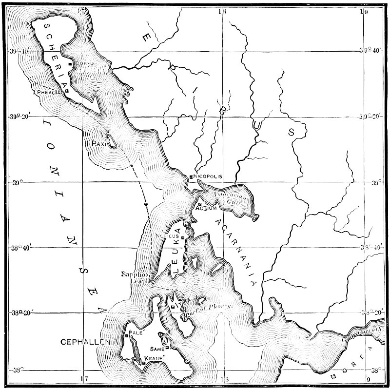 Released by Calypso, he goes on a raft with the sailing direction to keep the Great Bear, “which is also called the Wain,” on his left,—that is, he sails eastward, and for seventeen days splits the waves, and sees on the eighteenth the wooded mountain of the island of the Phæacians, the Scheria of the ancients. The continuity of tradition and the consistency of the narrative leave me no doubt that this was our Corfu, the uttermost of the lands positively known to the geography of that day. The actuality of Scheria has been disputed by certain German critics, who will have it that all the local allusions of the Odyssey are imaginary. But in the Æneid, when Æneas is going to Butrintum, which is now Butrinto, opposite Corfu on the Albanian coast, he says that no land was in sight except Scheria. This makes it certain that in Virgil’s time there was no question on the point.