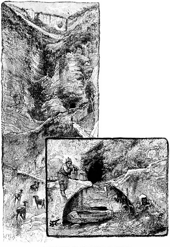 The glen of the Raven’s Cliff becomes a wild gorge below the fountain of Arethusa, and descends abruptly to the sea. Above, a stripe of bare, pale-gray rock down the cliff shows that in winter it is the location of a cataract, though, when I visited the locality, dry as summer dust. The fountain of Arethusa is situated about half-way from the cliff to the sea, and bears the evidences of an immense antiquity. Remains of an architectural surrounding are still to be seen, which, with some foundations of walls of the Roman period, evidently of a temple to the nymph or local goddess, and “Ulysses’ Castle,” are the only traces of ruin discoverable in this lobe of the island. The recess of the fountain has once been much larger, but 35 the slow process of depositing the calcareous incrustation which forms its walls has gone on so long that only a small deep basin remains, from which the people draw the water with a cord and bucket. Its niche is cushioned with moss and maidenhair ferns, and the soft porous rock is always moist with the filtering through of the water. A wooden trough is placed for the watering of the sheep and goats which take the place of the hogs of Eumæus, for this is the only perennial source of water in the region.
