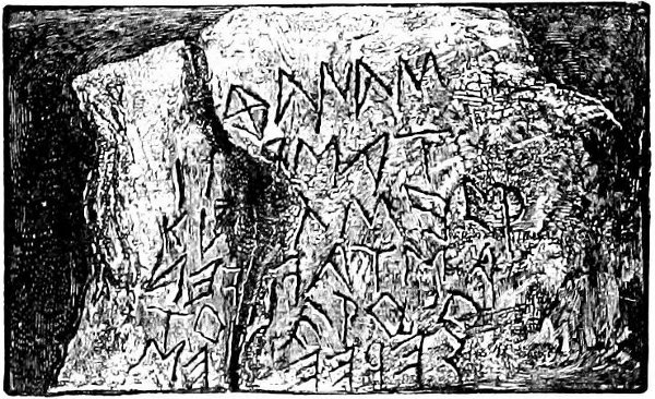In searching around the neighborhood for traces of antiquity I was accosted by a peasant, who told me that there had been found a stone with some letters on it, and I made haste to hunt it out. They (for there were two fragments) were at the bottom of a heap of stone which had been exhumed from under a land-fall, and which were evidently part of a very ancient building. I hired the men who gathered round to remove the heap, and photographed the stones, which had been originally one. The inscription is in the early style of Greek epigraphy, boustrophedon, i. e., going alternately from left to right and right to left, as oxen go when ploughing. It is the oldest known inscription in the Ithacan alphabet.