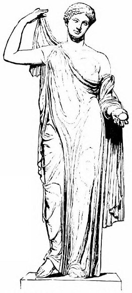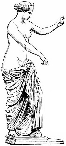 Now, what was the statue? We have so long been in the habit of accepting all female statues, not distinguished by well-known symbols of their divinity, as Venuses, that we make no distinction even in cases where the type demands it. And yet the dominant characteristic of Greek sculpture is this close adherence to established types. We are never at a loss to distinguish Diana, Minerva, Juno, or even Ceres and the lesser deities. Venus, it is true, came into vogue as subject for the sculptors of sacred statues later than some of the others; but all that we know of the Venus of the artists indicates that it was par excellence the womanly type. The treatment of the head in Greek sculpture was a point apparently of doctrine, as it was in Byzantine and in the later ecclesiastical art of Greece. It is always in a conventional type, utterly separated from the individual.