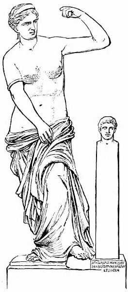 In the year 1820, before the struggle between the Hellenic population of the Turkish empire and the Porte had begun, and when all that attracted the notice of the civilized world to modern Greece was the little preserved to us of her art,—occasionally and fragmentarily found in the ruins of her great communities,—a peasant of Melos whose name was Theodore Kondros Botoni, working in his field to enlarge it by clearing away the débris of the walls and structures of ancient Melos (which had been built on a steep hill-side, on a series of terraces, more or less natural or artificial, so that the ruins of one terrace fell down upon and encumbered that below it), saw, to his great bewilderment, the heap of rubbish which he was digging away at the bottom suddenly crumble down and display the upper part of an antique statue. The peasant hastened to the French consul to inform him of the discovery, and the latter negotiated the purchase of it for five hundred piastres and a complete dress of the fashion of the country. This was the statue known as the Venus of Melos.