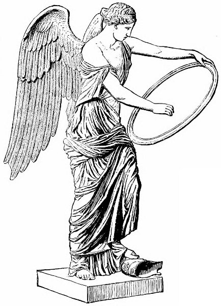 My theory, open to the grave objection that it is one in which hypothesis bears an undue proportion to proven fact (yet not so great as any of the group theories, and hardly more than any other theory, for all are constructed out of the same aerial substance), is that the Melian statue is the original Niké Apteros from the little temple on the Acropolis of Athens. If so, one can understand the whole of my theory of concealment, attribution, and type, because this statue above all others would come under the rancor of a victor and its flight would become an humiliation to Athens. It was like the standard of a defeated army, to be kept at all hazards from the enemy. Hurried away to Melos, it was safe from the invader, but no nearer point was secure. The restoration in my hypothesis becomes that of the Victory in some attitude connected with regarding, or recording, on the shield or a tablet the names of the Attic heroes, or battles, and my opinion is that she has just finished writing, but I am disposed to uncertainty on the exact phase of the action, only insisting on that of the Recorder. The minutiæ of description of many antique works of art which we owe to Pausanias and 101 Pliny was plainly impossible with this. Neither ever saw it, but its memory existed in artistic tradition and has been repeated in the statues we have seen, probably only a few of those which once existed.