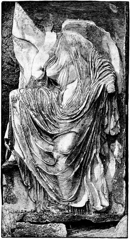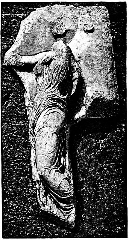 In working about the Acropolis of Athens some years ago, I photographed, amongst other sculptures, the mutilated Victories in the Temple of Niké Apteros, the “Wingless Victory,” the little Ionic temple in which stood that statue of Victory of which it is said that “the Athenians made her without wings that she might never leave Athens”; and looking at the photographs afterward, when the impression of the comparatively diminutive size had passed, I was struck with the close resemblance of the type to that of the “Venus” of Melos. There are the same large, heroic proportions, the same 96 ampleness in the development of the nude parts, the same art in the management of the draperies, and Richard Greenough, the American sculptor, has called my particular attention to the curious similarity in the treatment of the folds of the drapery, in the introduction of a plane between the folds, a resemblance not found in any other similar works as far as I know.