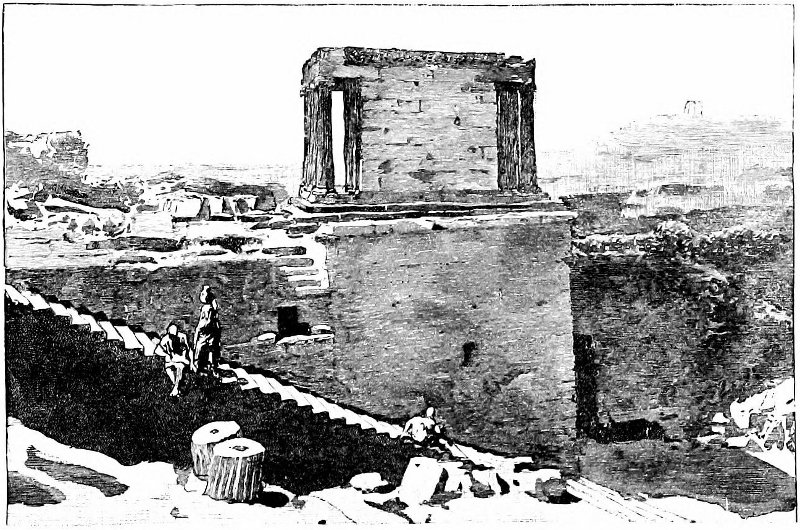 The little Temple of Niké Apteros has had a destiny unique 106 amongst its kind. Like the Parthenon, it was standing little more than two hundred years ago, but during the Turkish occupation it was razed, and its stones all built into the great bastion which covered the front of the Acropolis and blocked up the staircase to the Propylæa. It was dug out and restored, nearly every stone in its place, by two German architects during the reign of Otho, and it stands again as Pausanias describes it, on the spot where old Ægeus watched for the return of Theseus from Crete, and seeing the black sails of his son’s ship returning, token of failure (for Theseus had forgotten to raise the white sail, the signal of success), threw himself from the precipice, and was dashed into black death on the rocks below. In the distance are Salamis and Ægina, and the straits through which the ships came from Melos and Crete, and to the south is Hymettus, beyond which are Marathon and the road by which the Persians came, and the Turks after them. There certainly was the spot, and this the occasion, if ever, that an Attic sculptor should feel that spiritual enthusiasm below which Greek art stopped and lost the clew which, in later centuries, the Florentine found again and followed to new, if not higher, heights.