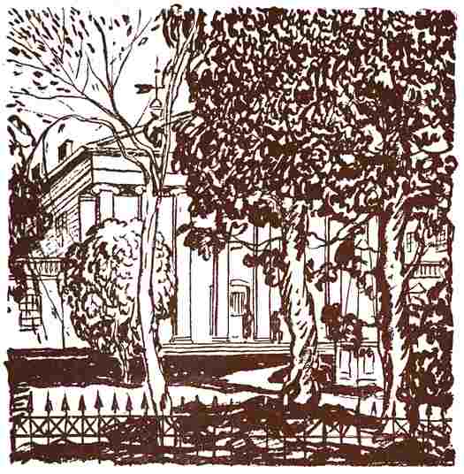 In a line, in the center of an eighteen hundred-foot lawn, stand the five main buildings, truly substantial and artistic. The view to the right and left is superb, tall trees shading walks and dividing stretches of lawn, with rows of benches scattered here and there. A statue by St. Gaudens beautifies the grounds between the main building and the governor’s residence, while in another direction a fountain fills to the brim a flower-lined marble basin. Everywhere about the grounds and buildings are seen nautical signs and many interesting reminders of the man who willed the refuge.