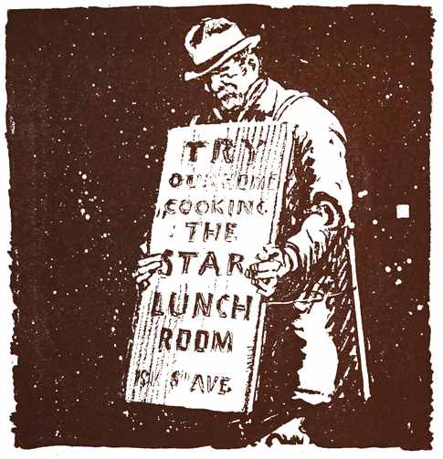I sometimes think that in our general life-classifications we neglect the individual, the exceptional individual, who is always sure to be everywhere, as readily at the bottom of society as at the top, as readily sandwiched between two glaring signs as anywhere else. It is quite all right to admit, for argument’s sake or our own peace of mind, that most of these men are dirty and worn and indifferent, and hence negligible; though it always seems silly to me to assume that a man is indifferent or negligible when he will pack a sign in the cold and snow in order to preserve himself. It is so easy for those of us who are comfortable to assume that the other man does not care, does not feel. Here he comes, though, carrying a sign. Why? To be carrying it because it makes no difference to him? Because he has no emotions? I don’t believe it. I could not believe it. And all the evidence I have personally taken has been to the contrary, decidedly so.