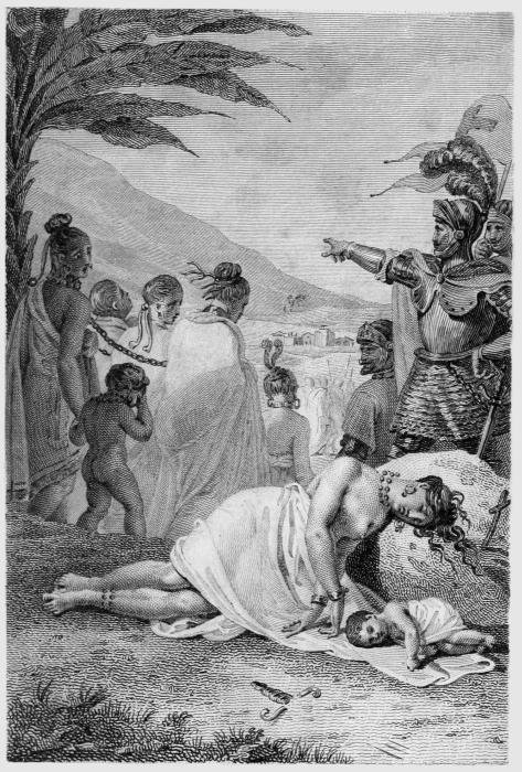 La reine donna dans le piége. Elle ne savait pas qu'en s'éloignant des Espagnols, les Indiens fuyaient de cruels oppresseurs; elle ne savait pas que, pour aller chercher et servir ces maîtres barbares, il fallait que les Indiens quittassent leurs cabanes, leurs femmes, leurs enfants, laissassent leurs terres incultes, et se rendissent au lieu marqué à travers des déserts immenses, exposés à périr de fatigue et de faim. Elle ordonna qu'on les obligerait à vivre en société et en commerce avec les Espagnols, et que chacun de leurs caciques serait tenu de fournir un certain nombre d'hommes pour les travaux qu'on leur imposerait.