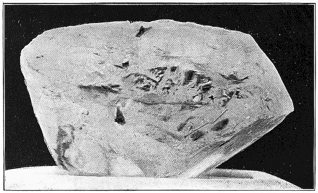 The diamond is remarkable in another respect. It is extremely transparent to the Röntgen rays, whereas highly refracting glass, used in imitation diamonds, is almost perfectly opaque to the rays. I exposed for a few seconds over a photographic plate to the X-rays the large Delhi diamond of a rose-pink colour weighing 31½ carats, a black diamond weighing 23 carats, and a glass imitation of the pink diamond (Fig. 18). On development the impression where the diamond obscured the rays was found to be[108] strong, showing that most rays passed through, while the glass was practically opaque. By this means imitation diamonds can readily be distinguished from true gems.