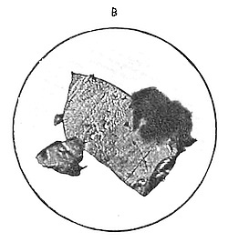 The residue is first heated for some hours with strong sulphuric acid at the boiling-point, with the cautious addition of powdered nitre. It is then well washed and for[119] two days allowed to soak in strong hydrofluoric acid in cold, then in boiling acid. After this treatment the soft graphite disappears, and most, if not all, the silicon compounds have been destroyed. Hot sulphuric acid is again applied to destroy the fluorides, and the residue, well washed, is attacked with a mixture of the strongest nitric acid and powdered potassium chlorate, kept warm—but not above 60° C., to avoid explosions. This treatment must be repeated six or eight times, when all the hard graphite will gradually be dissolved and little else left but graphitic oxide, diamond, and the harder carbonado and boart. The residue is fused for an hour in fluorhydrate or fluoride of potassium, then boiled out in water and again heated in sulphuric acid. The well-washed grains which resist this energetic treatment are dried, carefully deposited on a slide, and examined under the microscope. Along with numerous pieces of black diamond are seen transparent,[120] colourless pieces, some amorphous, others with a crystalline appearance. Fig. 21 B shows one of these crystalline fragments. Although many fragments of crystals occur, it is remarkable I have never seen a complete crystal. All appear shattered, as if on being liberated from the intense pressure under which they were formed they burst asunder. I have singular evidence of this phenomenon. A fine piece of artificial diamond, carefully mounted by me on a microscopic slide, exploded during the night and covered the slide with fragments. Moissan’s crystals of artificial diamond sometimes broke a few weeks after their preparation, and some of the diamonds which cracked weeks or even months after their preparation showed fissures covered with minute cubes. I have explained that this bursting paroxysm is not unknown at the Kimberley mines. So far, all such artificial diamonds are microscopic. The largest artificial diamond is less than one millimetre across.