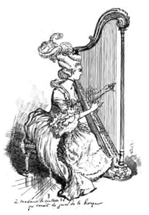 Mais en feuilletant le livre avec un intérêt déjà vaguement éveillé, des annotations au crayon apparurent de page en page, des renvois sautant aux yeux, des vers soulignés qui semblaient se répondre. En suivant avec ordre les indications crayonnées: «Page 159» ou «Voir réponse p. 28», en sautant d'une épigramme du chevalier de P… «contre un auteur qui avoit fait supprimer des écrits où il étoit maltraité», à un impromptu de M. Marmontel, secrétaire perpétuel de l'Académie française, «à Mme la comtesse de F… qui venoit de jouer de la harpe», en passant d'une ode anacréontique de M. le comte d'Aguilar, capitaine au régiment Royal-Pologne-Cavalerie, à Sophie abandonnée, chanson par M. Carnot, capitaine au corps royal du génie, de l'Académie de Dijon, à travers les deux cents pièces plus ou moins gracieusement rimées de ce recueil aimé des classes versifiantes,—bourgeoisie lettrée ou aristocratie pinçant de la petite lyre,—peu à peu l'ensemble des vers soulignés parut constituer une sorte de dialogue entre deux lecteurs, ou plutôt entre un lecteur et une lectrice qui se repassaient le livre l'un à l'autre et causaient avec une certaine animation d'abord, puis plus doucement, par l'organe des poètes de l'almanach, en empruntant sans façon la lyre de M. de Florian, de l'Académie française, celle du «petit vieillard», de la baronne de Bourdic ou de M. de Cubières, écuyer de Mme la comtesse d'Artois, auteur de la pièce qui clôt l'Almanach de 1789, un petit poème intitulé les États généraux de Cythère, et commençant ainsi: