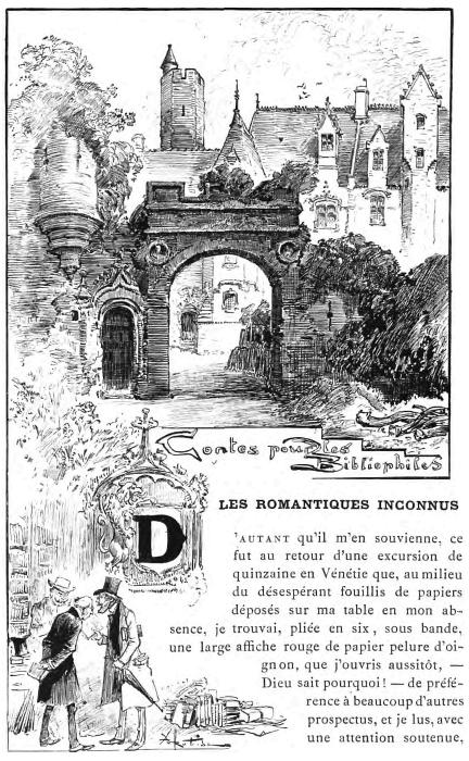 Ce fut il y a cinq ans, il vous en souvient, au cours de la dixième année d'existence de cette lourde revue Le Livre, dont vous étiez devenu sur le tard un précieux collaborateur, que nous échangeâmes, en une heure de répit, certains propos de Bibliofolie amusante groupés en une incohérence voulue, nous plaisant à échafauder un Recueil de Contes de tous les temps et de tous les pays, dont les thèmes divers nous mettaient en chasse d'étrangetés, et nous étions là, sondant le passé, scrutant l'avenir, dressant déjà une table des chapitres, émerveillés nous-mêmes de notre ingéniosité, comme le sont très souvent deux partners sympathiques dont les cerveaux délibérés ou présomptueux se passionnent à l'unisson, s'excitent, s'emballent et arrivent—sans préméditation aucune—à tisser le canevas précieux de quelqu'une de ces productions spontanées qui seraient légères et séduisantes si la température intellectuelle du lendemain ne les assassinait pas en refroidissant le germe dans l'œuf.