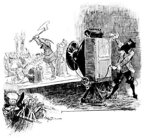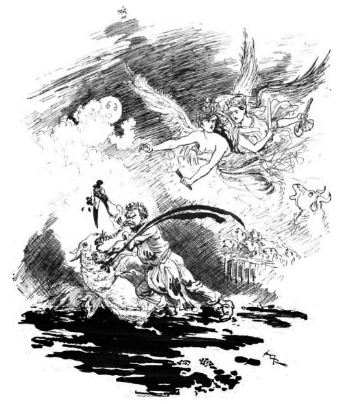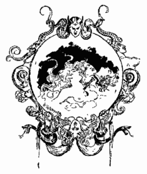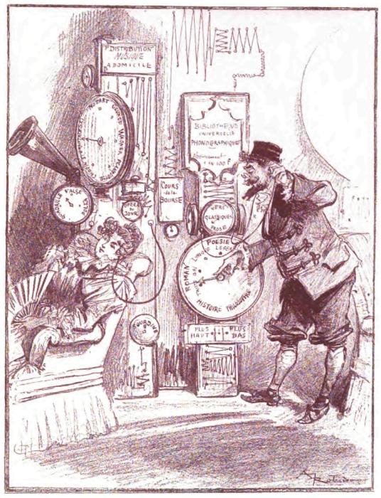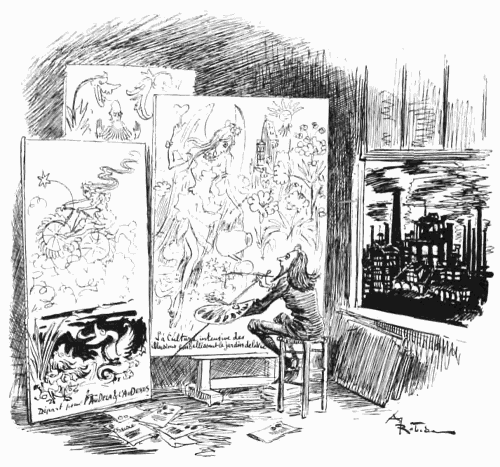 Mais vous, mon cher Robida le Téméraire, vous le moissonneur et le meunier de l'idée, vous qui semblez, comme Siva, ce dieu prodigieux de la triade indoue, posséder plusieurs bras et diverses faces, le tout au service de votre imagination surprenante et de vos observations précises et satiriques, vous qui êtes lumineusement sain et qui ignorez les états d'âme inquiets qui Hamletisent la plupart des artistes contemporains, vous m'apportiez, huit jours plus tard, votre premier conte illustré, l'Héritage Sigismond; vous posiez, par conséquent, la pierre angulaire de l'Édifice, et moi, pauvre retardataire, entraîné par votre exemple, me sentant embarqué malgré mes protestations intimes par votre esprit d'aventure vers les contrées incertaines et touffues de cette œuvre nouvelle, je me prenais à ramer à vos côtés, bien irrégulièrement toutefois, vous contraignant à m'attendre des mois et des années, tandis que je tirais des bordées sous des vents contraires ou que je faisais escale à divers ports d'attache: Revues, journaux et livres, avant de reprendre pour quelques instants ma place à vos côtés.