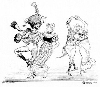 Et quels plaisants dessins que les vôtres, mon brave Robida, lorsque d'une plume ou d'un crayon mordants, qui se ruent à l'assaut du papier virginal, vous pastichez à plaisir les Johannot, les Deveria, les Nanteuil, les Carle Vernet, les imagiers d'Épinal de l'Empire, les vignettistes allemands ou les petits-maîtres du dernier siècle? Vous déroutez positivement, dans ces fresques hors texte du livre, le public de demi-connaisseurs, c'est-à-dire le grand public, car votre science imperturbable de la manière d'autrui et d'autrefois surprend vos nombreux admirateurs, qui vous tiennent peut-être rigueur de votre extrême sagacité comme on est déconcerté par un pince-sans-rire inquiétant.