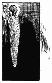 Cependant, tandis que le conservateur recueillait les papyrus qu'il avait charge de restaurer et de reconstituer, le docteur F… continuait placidement son opération minutieuse et peu à peu apparaissait plus fluette, plus osseuse, plus lamentable, la ligne de ce petit corps de roi desséché, dont les dernières bandelettes de lin masquaient maintenant à peine le visage. L'ultime voile qui couvrait la tête fut enfin déroulé et la figure de la momie fut visible; mais, à la stupeur générale, on s'aperçut qu'elle portait sur le front, contrairement à l'usage, un large bandeau d'or sur lequel était gravée une inscription, qui parut d'abord indéchiffrable et qui nécessita une longue consultation des Égyptologues assemblés.